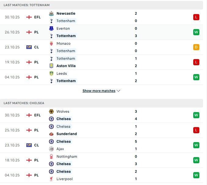 Phong độ 2 đội Tottenham vs Chelsea gần đây