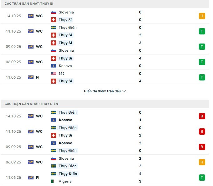 Phong độ 2 đội Thụy Sĩ vs Thụy Điển gần đây