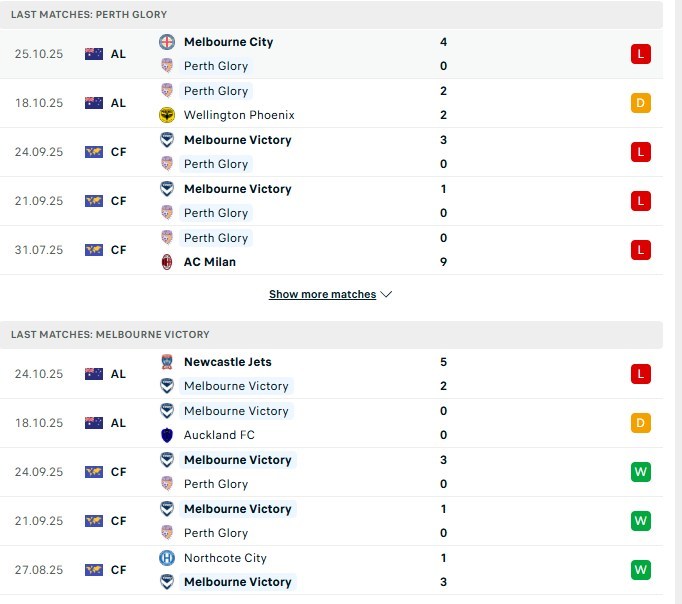 Phong độ 2 đội Perth Glory vs Melbourne Victory gần đây