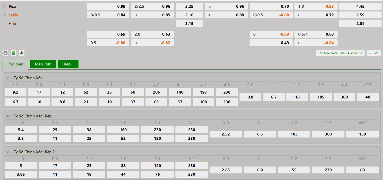 Pisa chơi trên sân nhà nhưng họ đủ ý thức rằng đối thủ là một Lazio khó chịu và nếu như thi đấu mất tập trung thì việc đội chủ nhà phải nhận bàn thua ngay trong hiệp 1 là điều có khả năng sẽ xảy ra. Pisa đã để thủng lưới 12 lần tại Serie A mùa bóng năm nay. Con số thống kê chỉ ra rằng 3/5 trận đấu gần nhất của Pisa có tối thiểu 1 bàn thắng trong hiệp đấu đầu tiên. Ngoài ra 4/5 trận trở lại đây của Lazio có bàn trong hiệp 1.