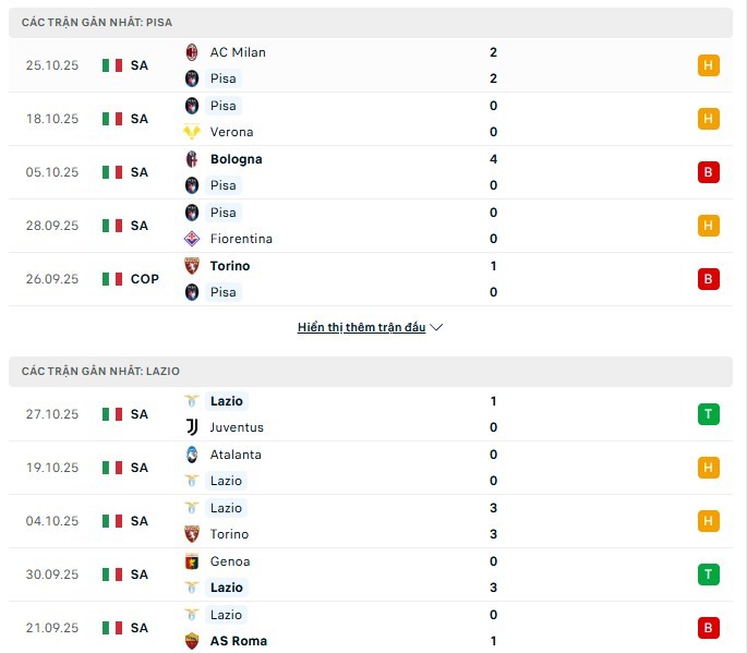 Phong độ 2 đội Pisa vs Lazio gần đây